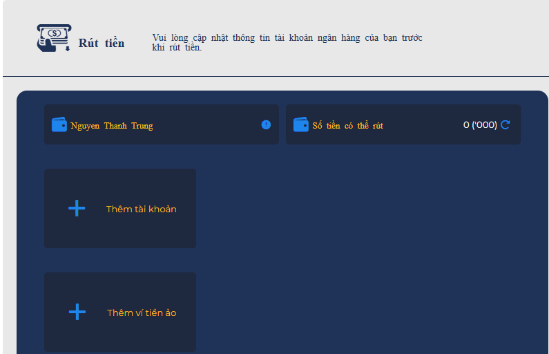 Người chơi sẽ thực hiện điền những thông tin cần thiết để có thể tiến hành giao dịch rút tiền. Gồm có những thông tin sau: